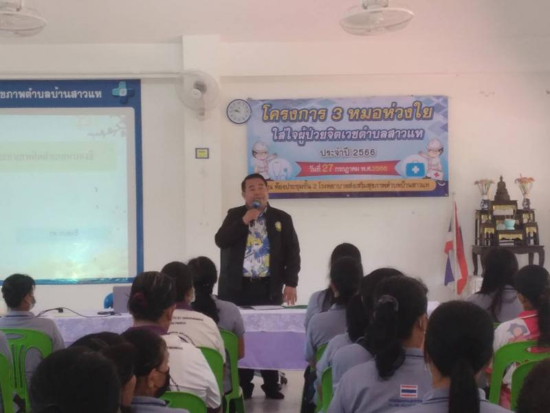 วันที่ 27 กรกฎาคม 2566 นายกชนะชาญ ศรีปัญญา นายก อบต.สาวแห เป็นประธานเปิดโครงการ 3 หมอห่วงใยใส่ใจผู้ป่วยจิตเวชตำบลสาว ประจำปี 2566