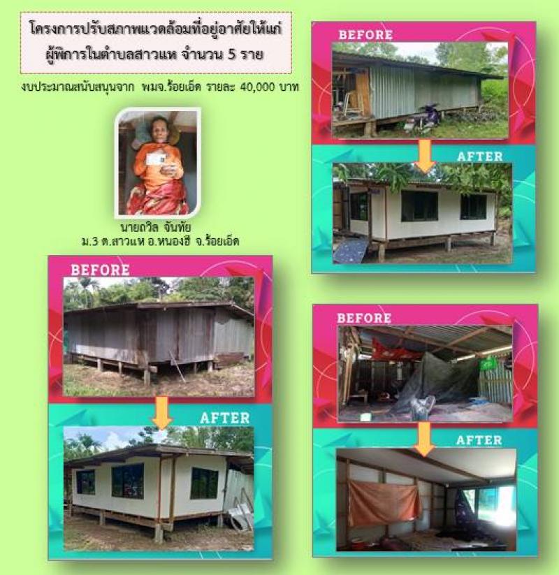 อบต.สาวแห ได้รับงบประมาณสนับสนุนในการปรับสภาพแวดล้อมที่อยู่อาศัยให้แก่ผู้พิการ ประจำปี งบประมาณ 2566 จาก สำนักงานพัฒนาสังคมและความมั่นคงของมนุษย์ จังหวัดร้อยเอ็ด จำนวน 5 ราย เป็นเงินทั้งสิ้น 200,000 บาท (รายละ 40,000 บาท)