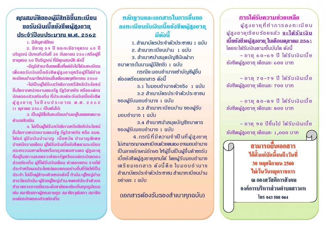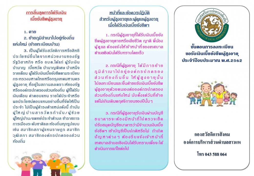 ประชาสัมพันธ์ แผ่นพับขั้นตอนการลงทะเบียน ขอรับเงินเบี้ยยังชีพผู้สูงอายุ ประจำปีงบประมาณ พ.ศ.2562