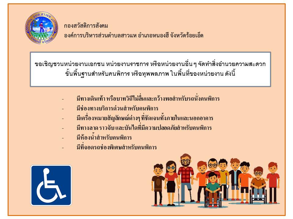 ชื่อเรื่อง : อบต.สาวแห ประชาสัมพันธ์เชิญชวนหน่วยงานต่างๆ จัดทำสิ่งอำนวยความสะดวกขั้นพื้นฐานสำหรับคนพิการ