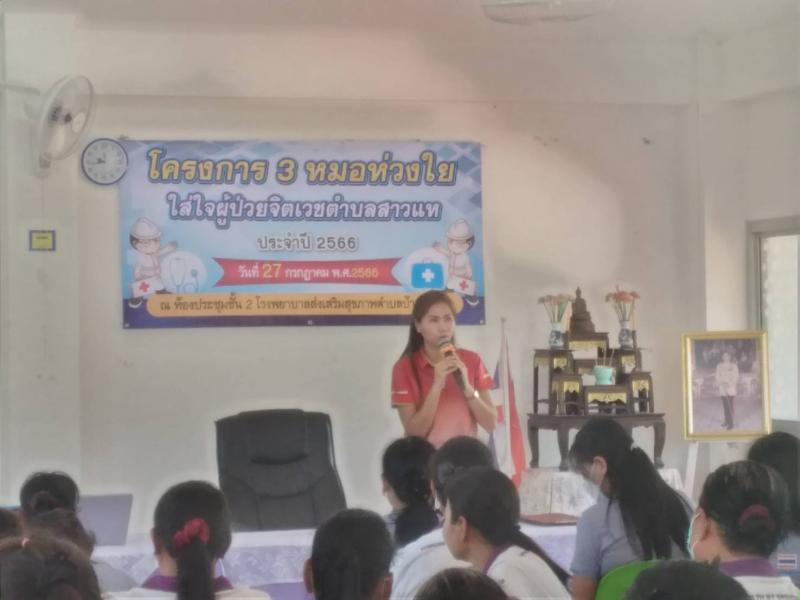 วันที่ 27 กรกฎาคม 2566 นายกชนะชาญ ศรีปัญญา นายก อบต.สาวแห เป็นประธานเปิดโครงการ 3 หมอห่วงใยใส่ใจผู้ป่วยจิตเวชตำบลสาว ประจำปี 2566