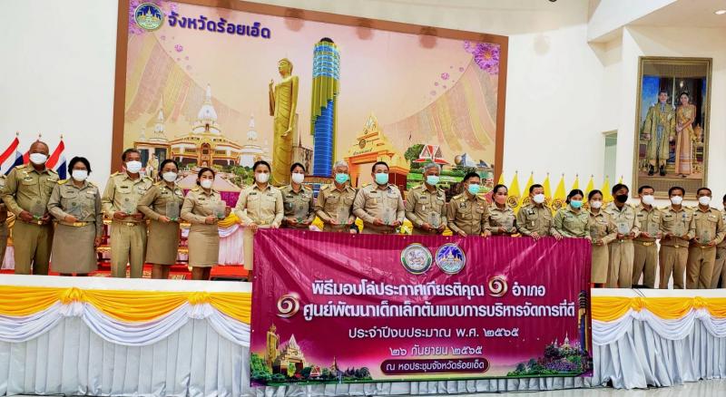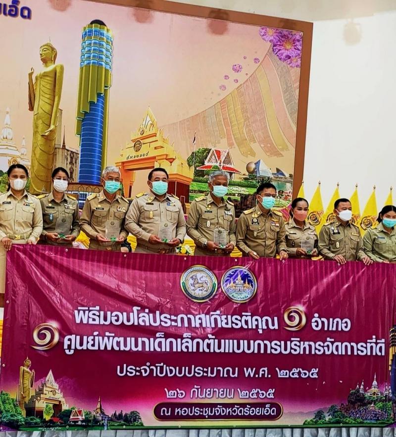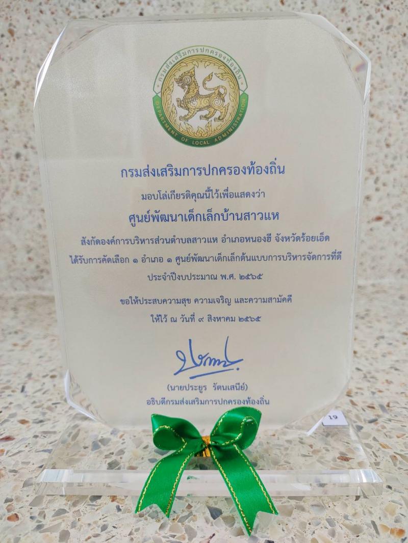 วันที่ 26 ก.ย.65 เวลา 09.00น. นายชนะชาญ ศรีปัญญา นายกองค์การบริหารส่วนตำบลสาวแห เข้ารับมอบโล่ประกาศเกียรติคุณ 1 อำเภอ 1 ศูนย์พัฒนาเด็กเล็กต้นแบบการบริหารจัดการที่ดี ประจำปีงบประมาณ พ.ศ. 2565 ณ หอประชุมจังหวัดร้อยเอ็ด