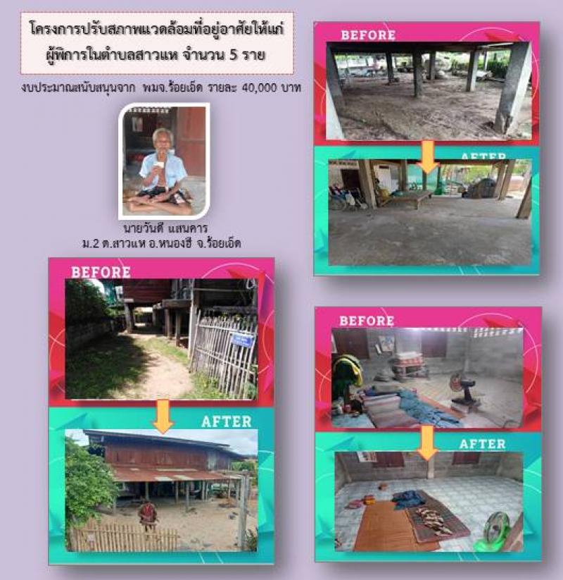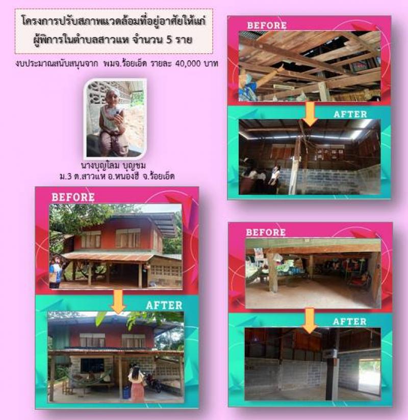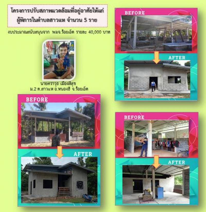 อบต.สาวแห ได้รับงบประมาณสนับสนุนในการปรับสภาพแวดล้อมที่อยู่อาศัยให้แก่ผู้พิการ ประจำปี งบประมาณ 2566 จาก สำนักงานพัฒนาสังคมและความมั่นคงของมนุษย์ จังหวัดร้อยเอ็ด จำนวน 5 ราย เป็นเงินทั้งสิ้น 200,000 บาท (รายละ 40,000 บาท)