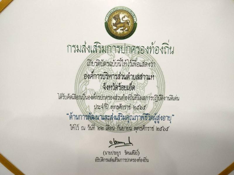 วันนี้ 29 พฤศจิกายน 2565 นายชนะชาญ ศรีปัญญา นายกองค์การบริหารส่วนตำบลสาวแห ขึ้นรับมอบเกียรติบัตรของกรมส่งเสริมการปกครองท้องถิ่นจากท่านผู้ว่าราชการจังหวัดร้อยเอ็ด เนื่องในโอกาสที่ได้รับรางวัลชนะเลิศ การคัดเลือกเป็นองค์กรปกครองส่วนท้องถิ่นที่มีผลการปฏิบัติงานดีเด่น ด้านการพัฒนาและส่งเสริมคุณภาพชีวิตผู้สูงอายุประจำปี 2565 #กองสวัสดิการสังคมองค์การบริหารส่วนตำบลสาวแห